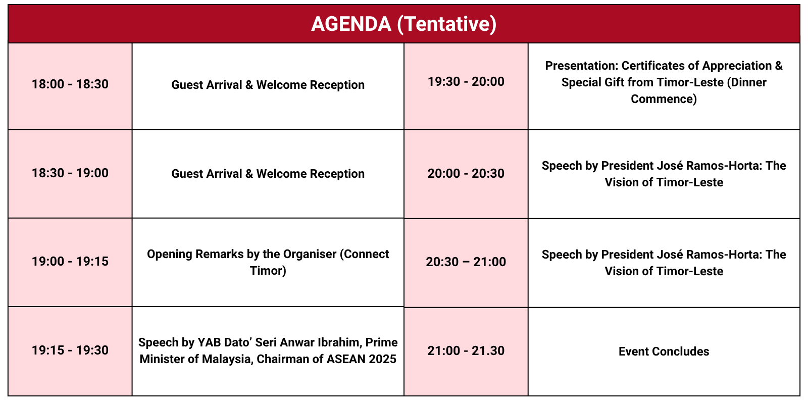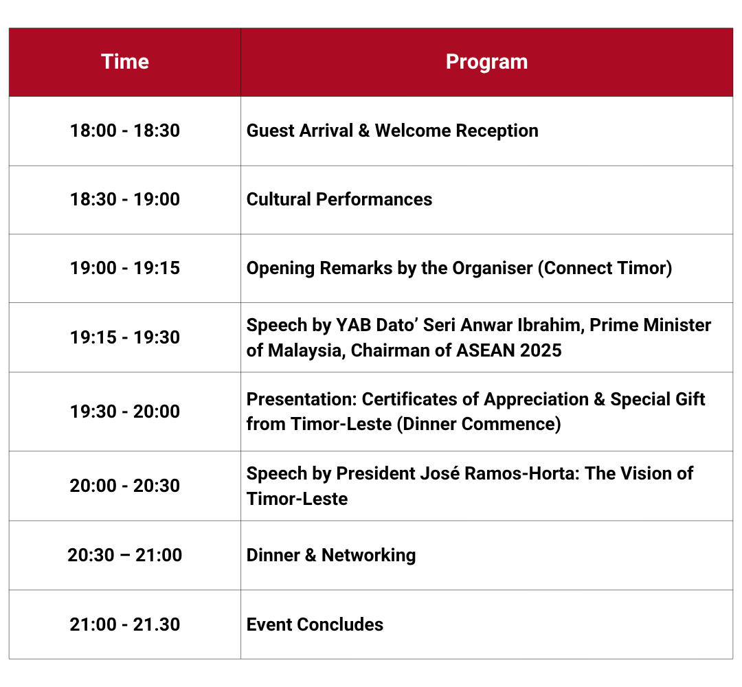 On October 26, 2025, Timor-Leste will officially become the 11th member of the Association of Southeast Asian Nations (ASEAN). To celebrate this historic milestone, the President of Timor-Leste will attend a commemorative banquet in Kuala Lumpur together with Malaysian Prime Minister Anwar Ibrahim. Approximately 200-300 distinguished guests from various sectors of society will join the celebration.